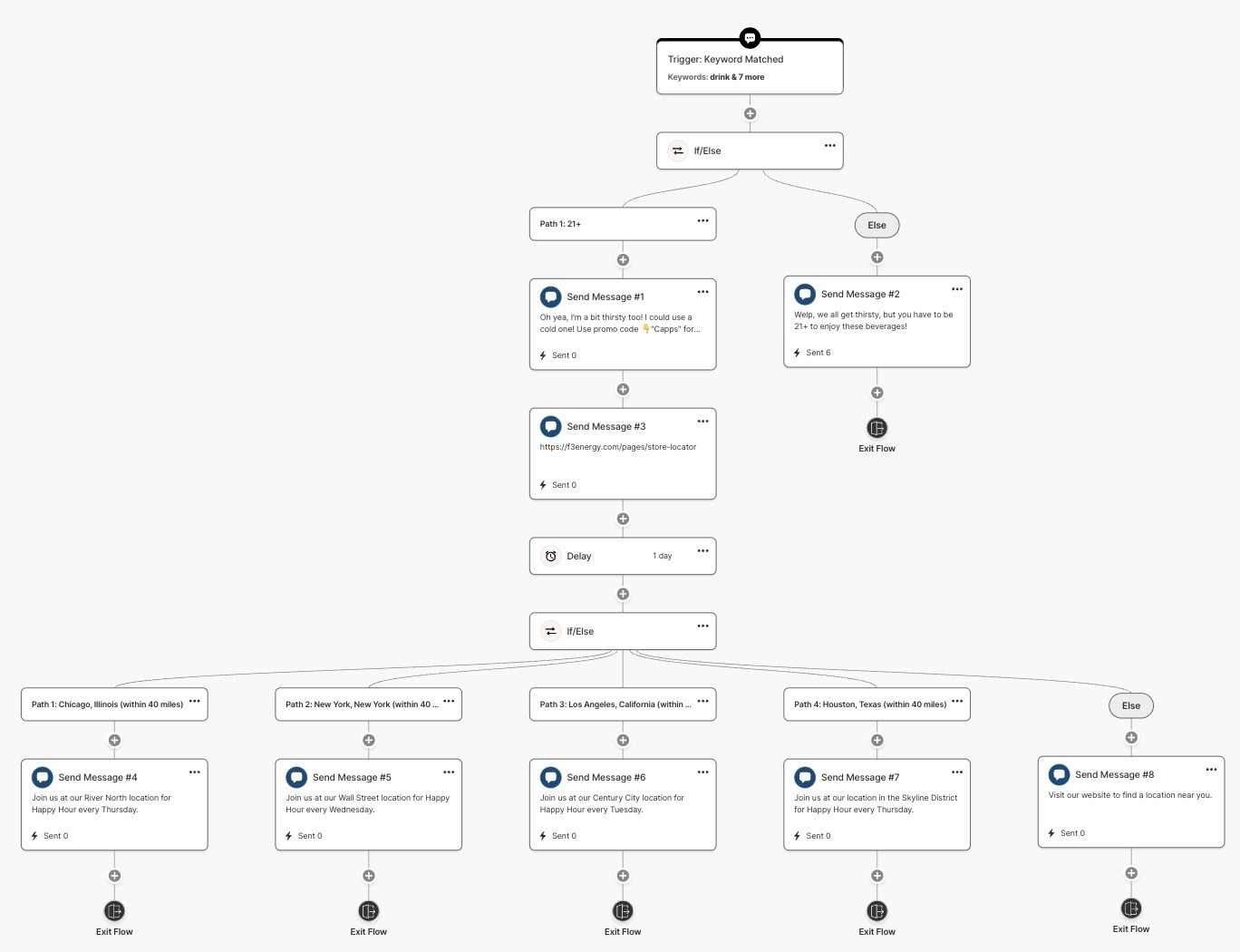 You can layer if/else logic into any level of your flows. In the same flow above, after you decide who is 21, you can then use if/else branching logic to give them specific messages if they live in Chicago, Los Angeles, New York or Houston. Think of it as a decision tree: members will be routed down different paths, with different messages, depending on who they are, what they like, demographics, etc. This makes your automated Flows smarter, more dynamic, and more personalized without adding complexity.